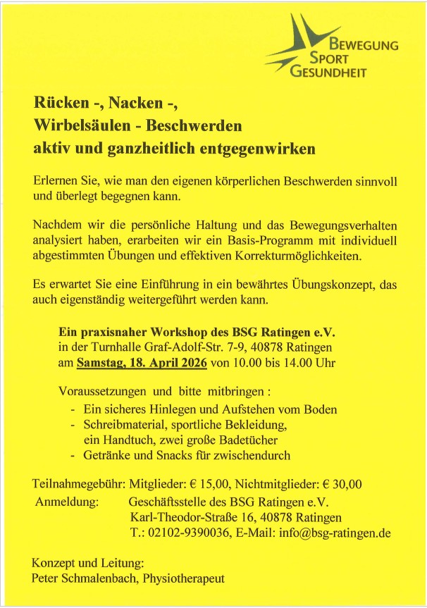 Anmeldungen möglich per Mail: info@bsg-ratingen.de oder telefonisch 02102-9390036 oder persönlich im BSG-Büro (Geschäftszeiten beachten).